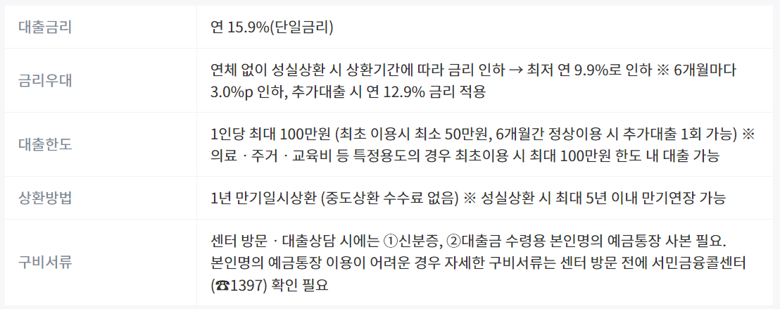 또 대출신청 전에 서민금융진흥원의 금융교육을 이수하면 0.5%p 우대금리를 적용하여 최종금리 9.4%를 적용받을 수 있다고 하니 금융교육 꼭 이수받으시고 우대금리 혜택 받으시길 바랍니다.