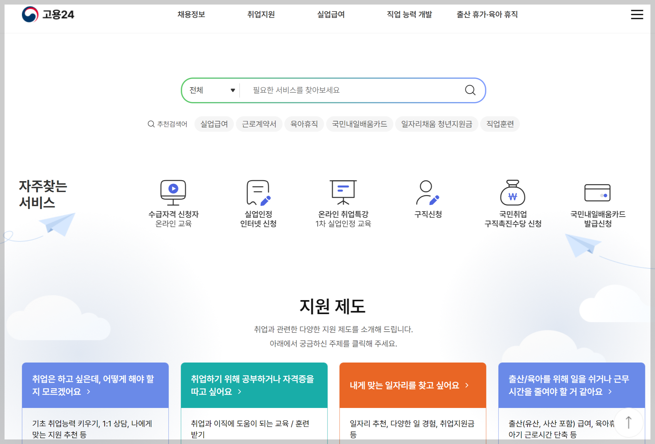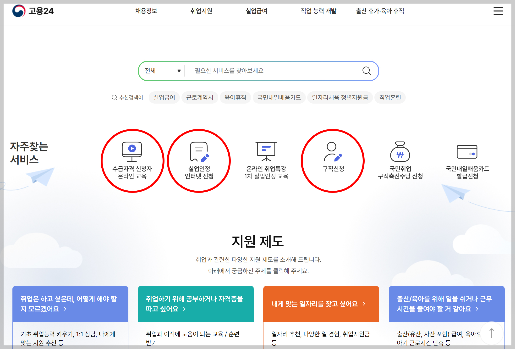 실업급여 수급 자격이 충족되면, 고용24(work24.go.kr) 홈페이지에 접속해 자주찾는 서비스에서 1. 구직신청, 2. 수급자격 신청자 온라인 교육, 3. 실업인정인터넷 신청을 순으로 진행하면 됩니다.