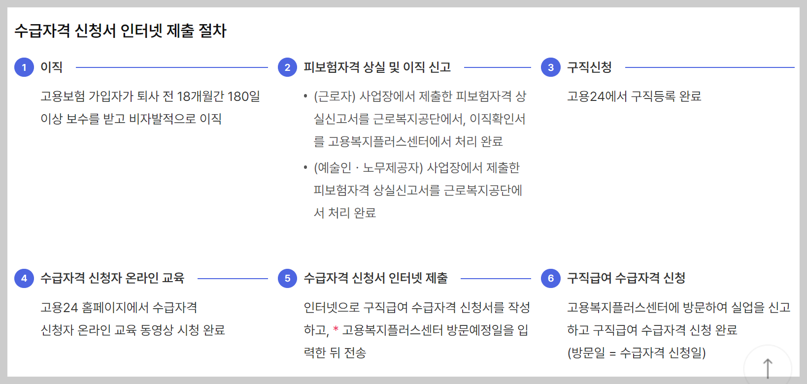 5. 고용복지플러스센터에 방문하여 실업을 신고하고 구직급여 수급자격 신청을 완료합니다. 이때 고용복지플러스센터 방문일이 수급자격 신청일이 됩니다.
